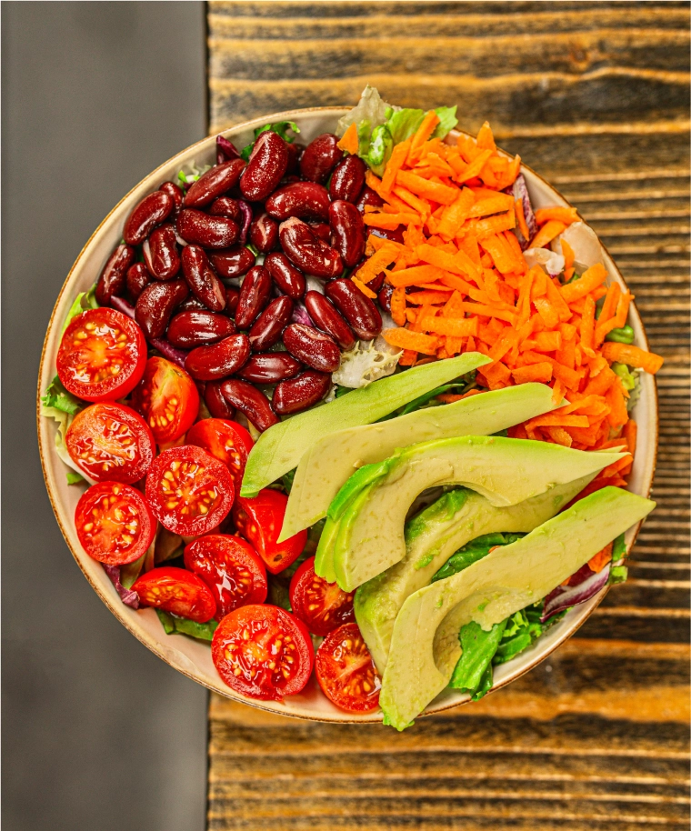 Salat, Tomaten, Kidneybohnen, Avocadoscheiben und Möhren