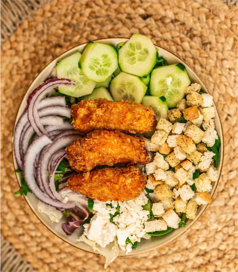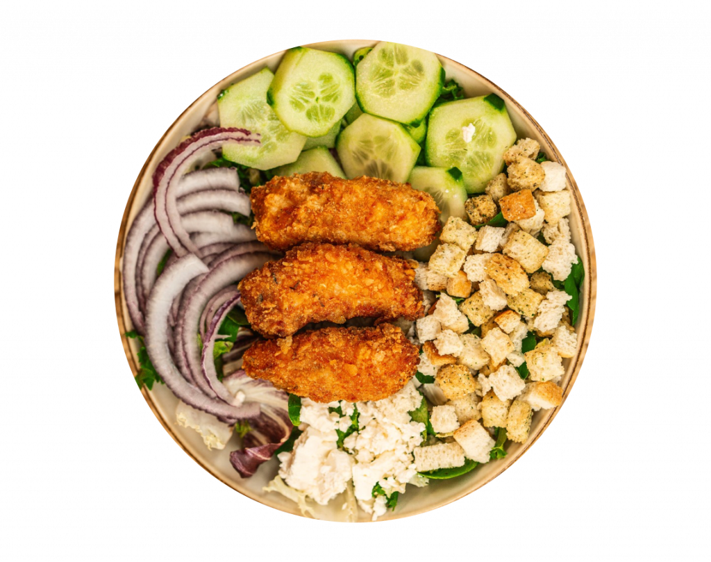 Salat, Gurken, Zwiebeln, Schafskäse, Croûtons, Chicken Sticks